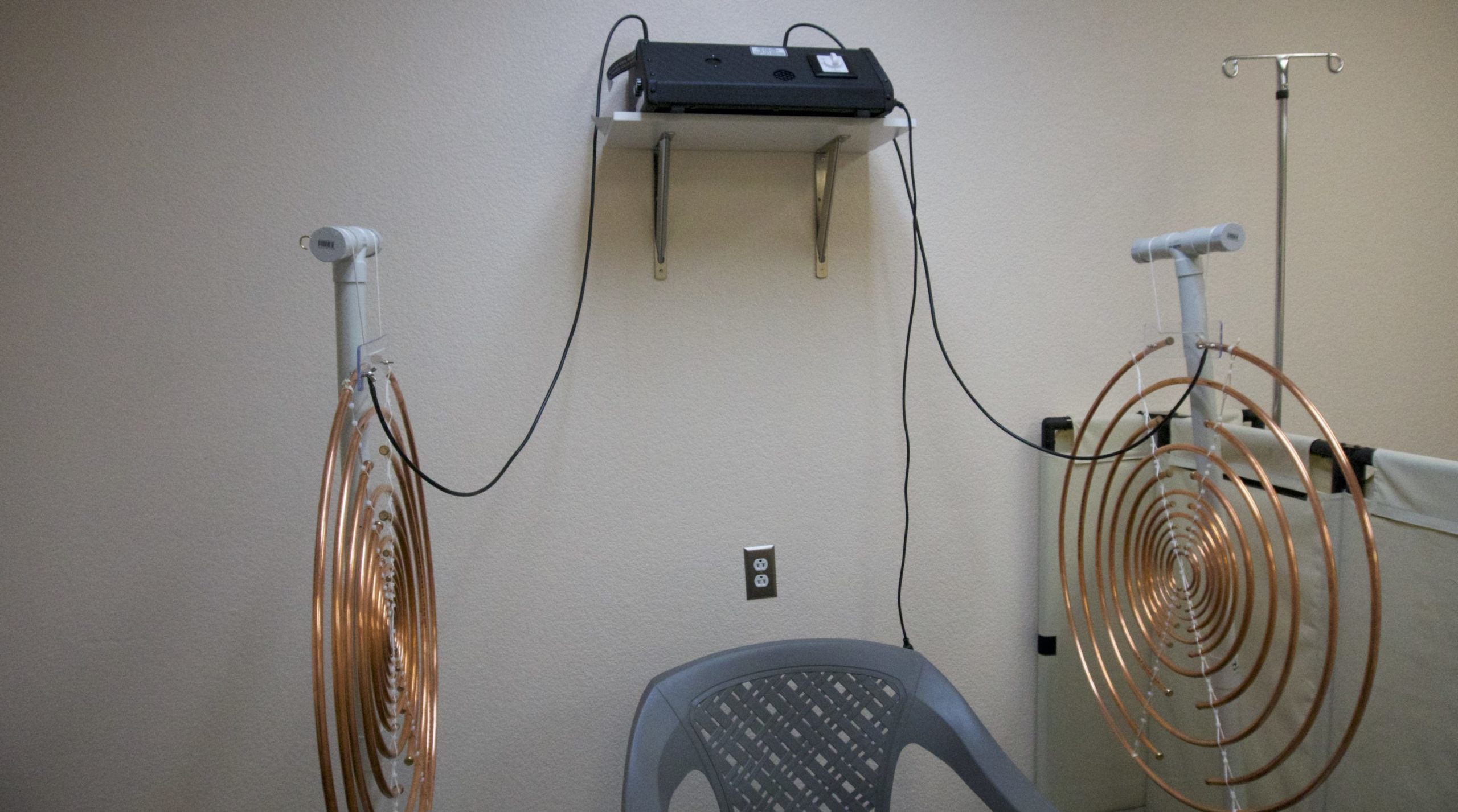 The MWO uses a Tesla coil and a copper antenna with concentric rings. The MWO stands and the chair used for the user of the MWO cannot contain any metal, therefore PVC or other platic is used.  Sessions are 15-60 min long and it could be used 1-4 times per week.